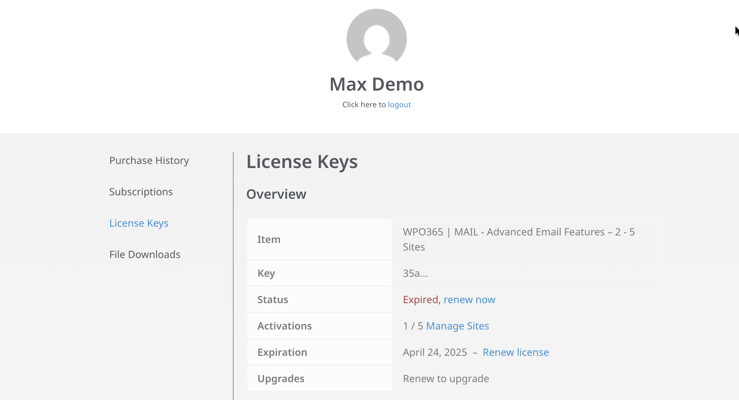 Proceed to the Licenses section to review your License Keys and their current statuses.