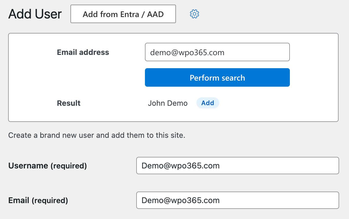 Note that this feature focuses on manually adding a new WordPress user by performing a lookup in Entra ID (formerly Azure Active Directory). WPO365 also offers several automated user enrollment options, such as bulk synchronizing users from Entra ID to WordPress or integrating with Entra ID’s SCIM-based Application Provisioning Service. |