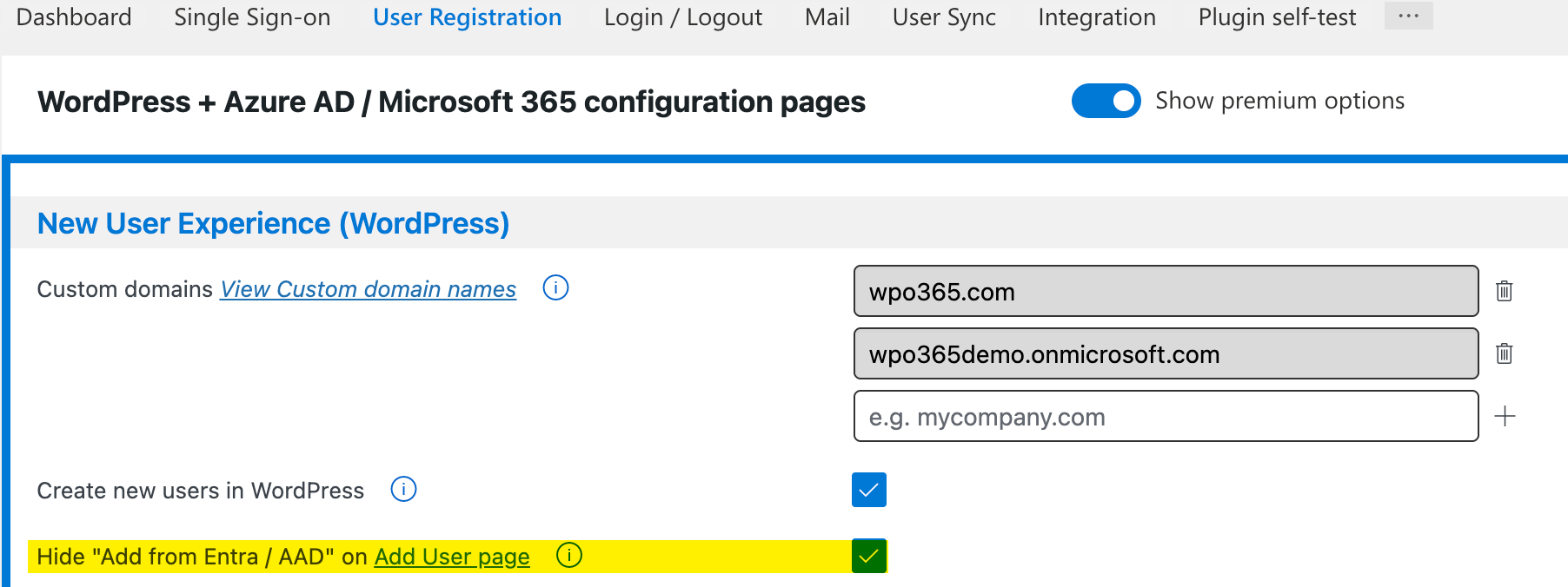 To show or hide the Add from Entra / AAD button on WordPress's built-in "Add User" page, you can check the corresponding option on the plugin's User Registration configuration page, as shown below.