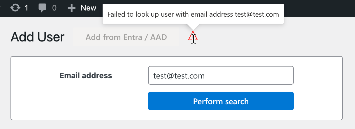 This guide explains how to manually add a new WordPress user by performing a lookup in Entra ID (Azure Active Directory), directly from WordPress's built-in 'Add New User' page, as shown below.