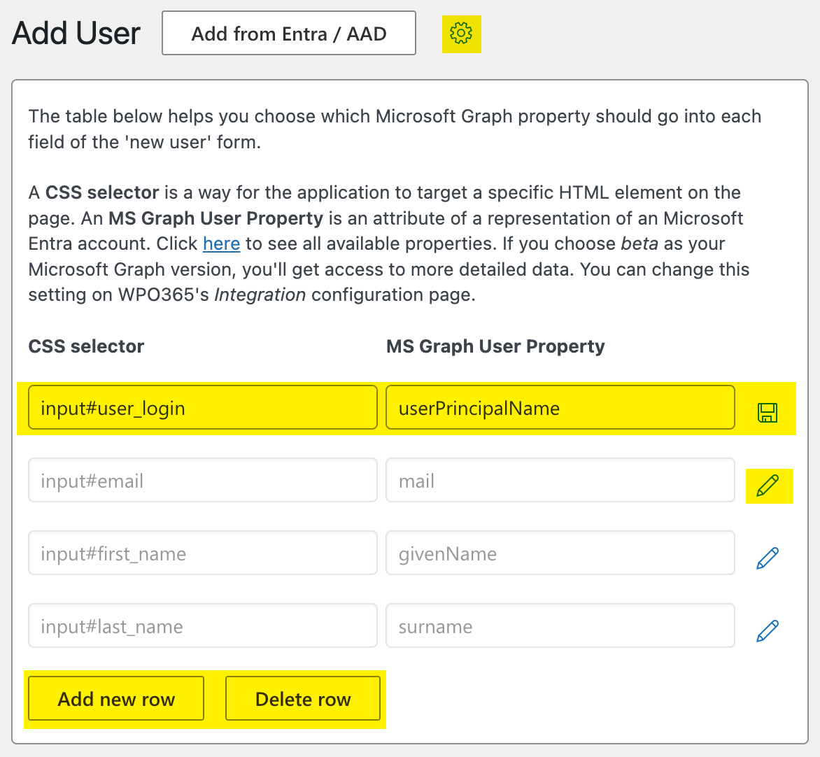 - Use the form to update the current mapping between the form fields - selected using CSS selectors - and the corresponding Microsoft Graph User resource properties they should be populated with. Click here for a list of all available properties.
